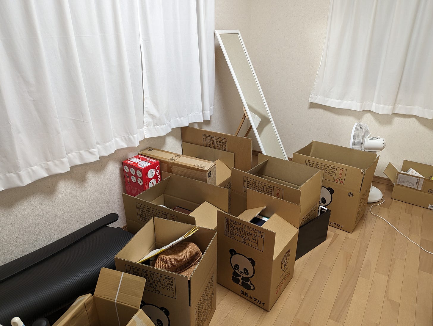 荷造り中の我が家です。夫婦で数時間も取り組めばすべて片付くくらいの量なので、それほど大変じゃありません。2年ごとに引っ越すことにしておけばコンパクトな生活を維持できるでしょうか。