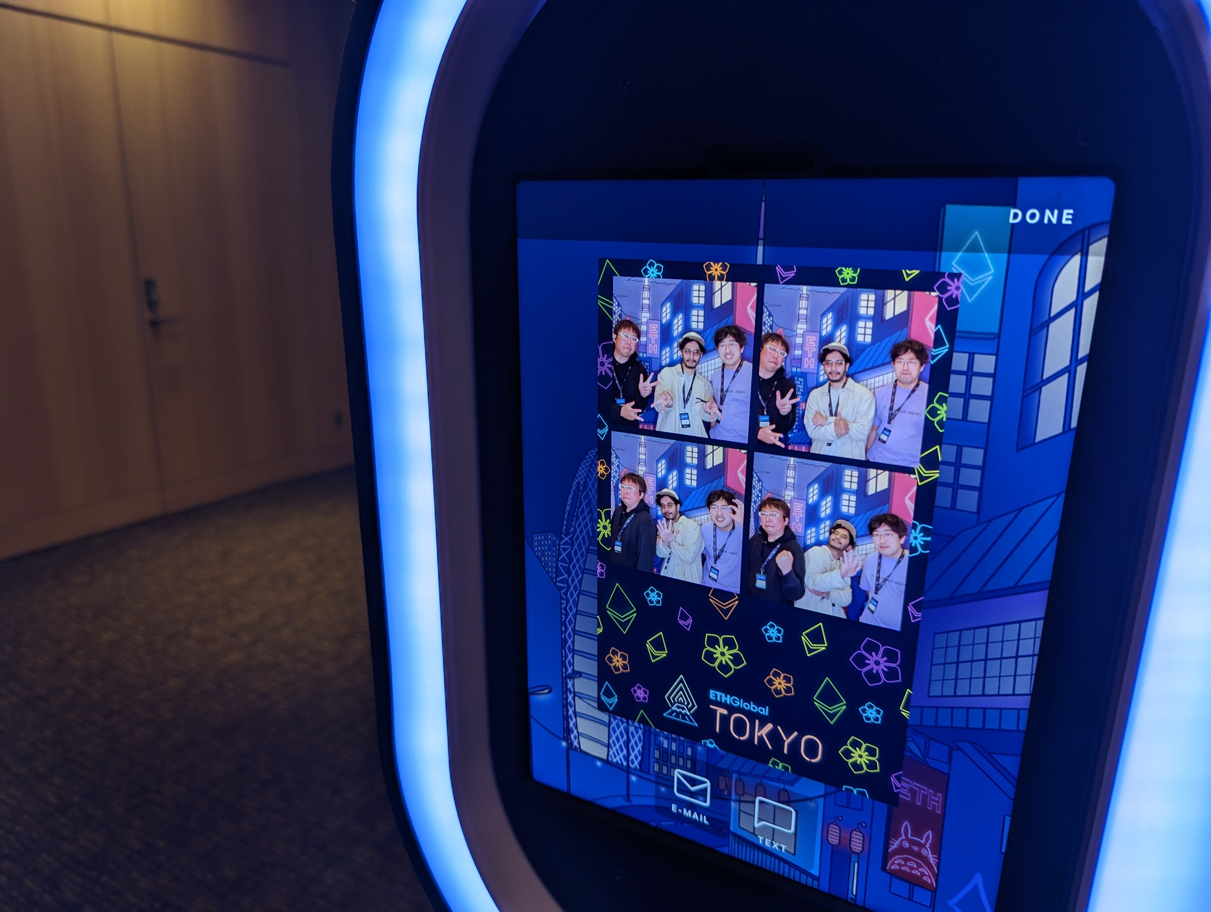 「ETHGlobal Tokyo」の会場で撮ったプリクラの様子です。金曜日の夜なのでまだまだ元気な私たち。このあと、どんどんヘロヘロになっていきます。