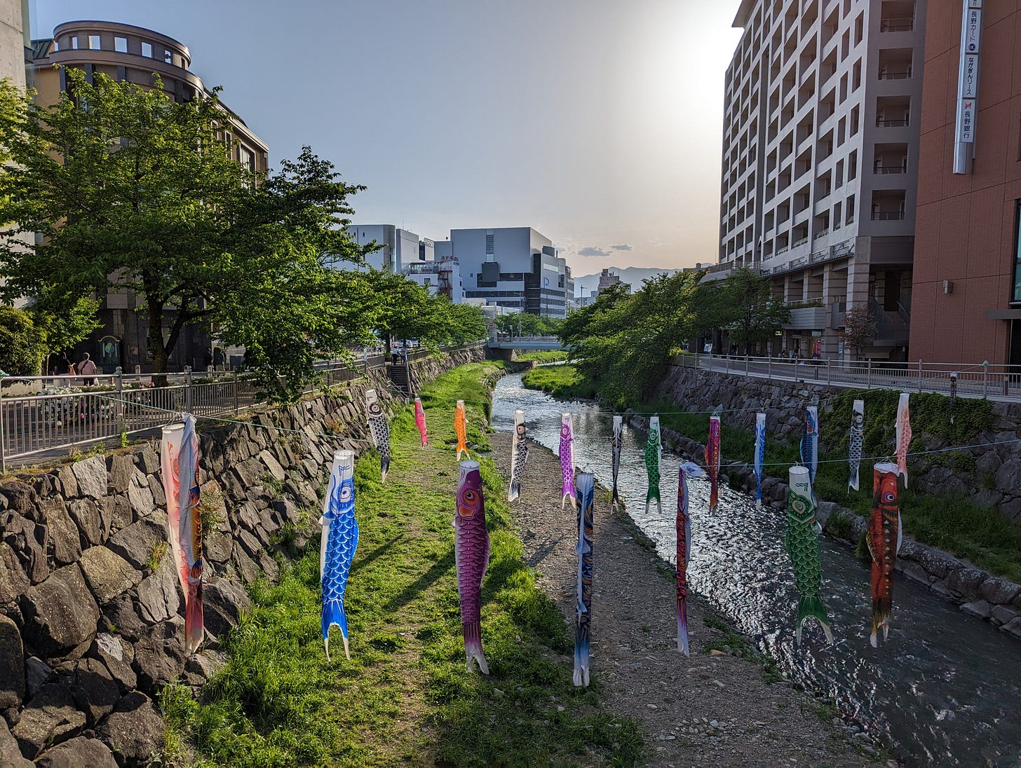 季節を感じる「鯉のぼり」の写真を選びました。この日は風がほとんどなくて、重力に引っ張られてまっすぐ下に伸びた鯉たちです。千歳橋からぱしゃり。