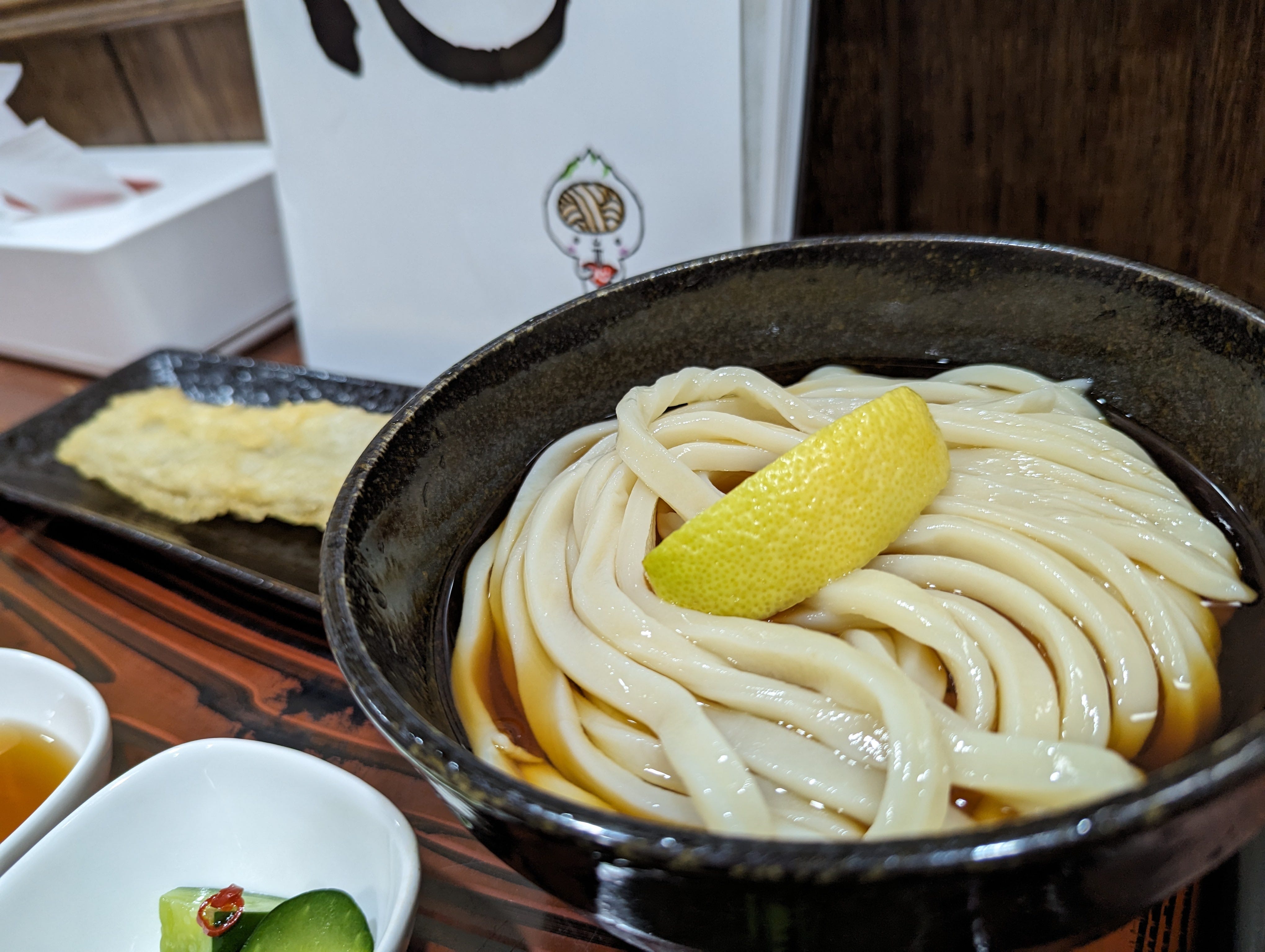 「手打ちさぬきうどん 心」で食べた、冷たいうどん。ぼくがこれまで食べてきたうどんの中でいちばん弾力があって、おもしろ食感でした。このあたりはお蕎麦屋さんが多い中で、おいしいうどんを出してくれるお店があるのはありがたい。
